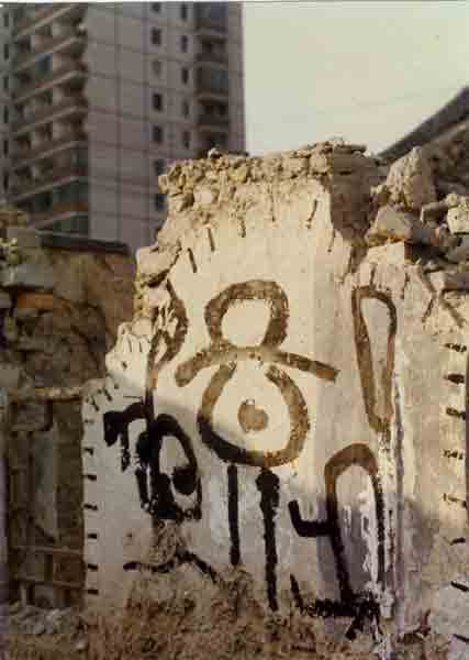 Tuschezeichnung auf einer Hausruine in Peking