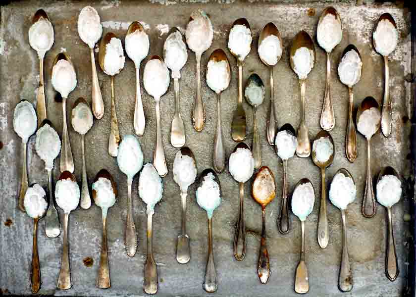 Silberlöffel mit auskistallisiertem Salz auf Salz-Zuckerlösung in Metallträger